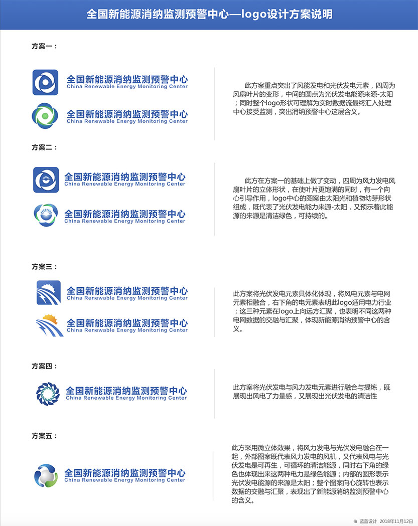 制約新能源消納的關(guān)鍵因素,為新能源的優(yōu)化布局和行業(yè)政策制定提供參考,促進(jìn)我國新能源高質(zhì)量發(fā)展。 藍(lán)藍(lán)設(shè)計對全國新能源消納監(jiān)測預(yù)警中心的工作范圍做了調(diào)查研究,首先理解業(yè)務(wù)和核心競爭力,之后調(diào)查了行業(yè)相關(guān)品牌標(biāo)志設(shè)計,聽取了大家的期望,之后設(shè)計出多版logo供選擇。標(biāo)志設(shè)計確定后進(jìn)行了VI和宣傳冊的設(shè)計。