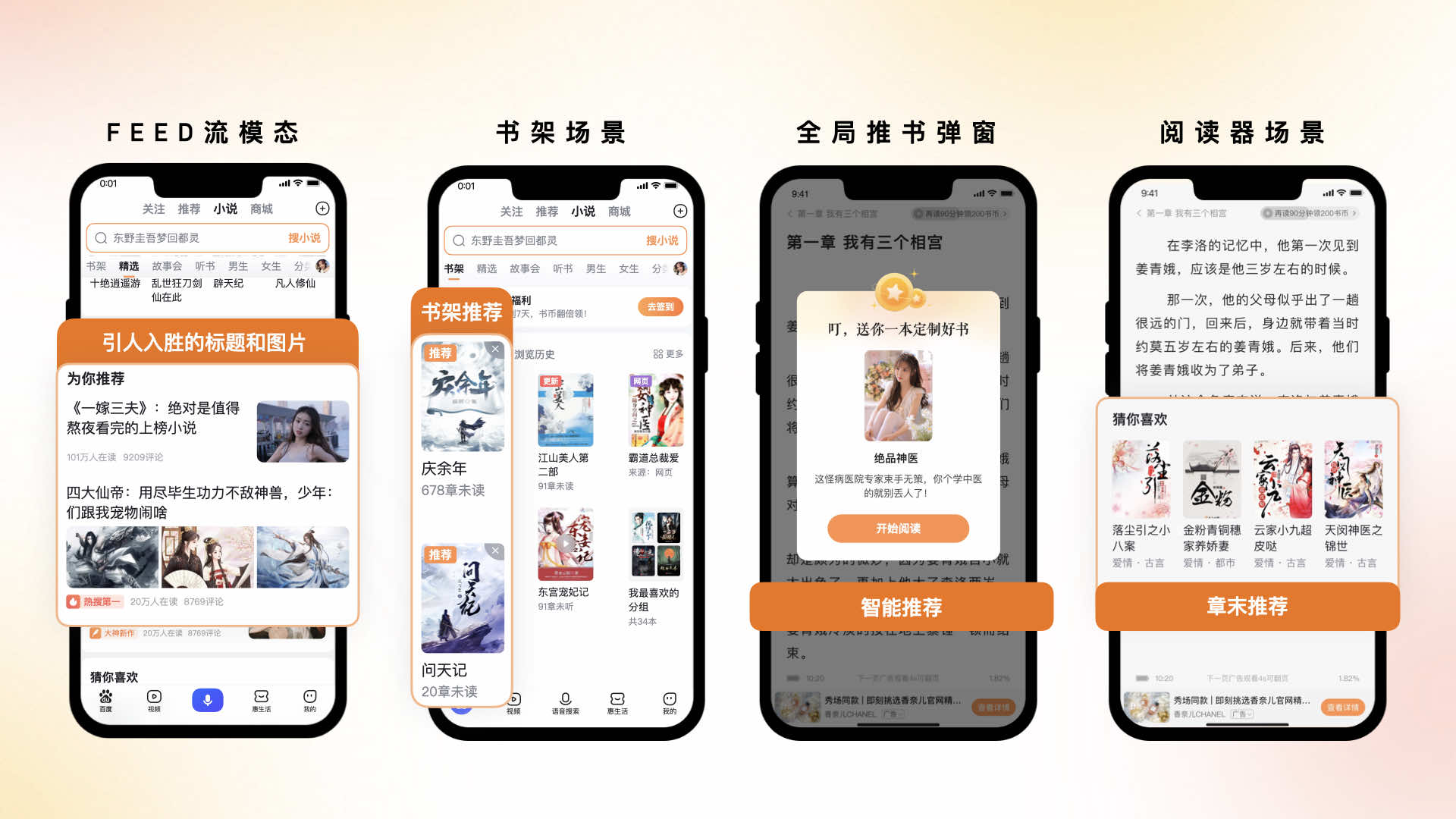 在推薦形式上,我們也采用了多樣化的推薦方式。例如在首頁(yè)增加了feed流形態(tài)的信息模塊,以更直觀的圖文展現(xiàn)方式,幫助用戶發(fā)現(xiàn)他感興趣的內(nèi)容。在書架場(chǎng)景,針對(duì)于書架內(nèi)容少的用戶,自動(dòng)的放置兩本高流量書籍,幫助用戶高效的觸達(dá)內(nèi)容。與此同時(shí),我們還會(huì)根據(jù)用戶行為數(shù)據(jù),采用彈窗形式和章尾推薦等形式主動(dòng)向用戶推薦與其喜好度高的內(nèi)容,方便用戶高效的觸達(dá)他感興趣的內(nèi)容。