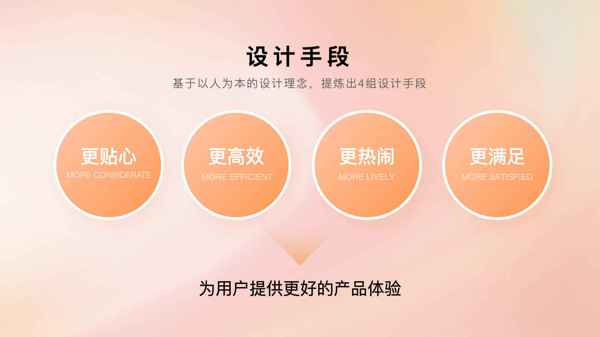 以人為本的設(shè)計(jì)理念不僅僅是視覺(jué)層面的展現(xiàn),還需要從用戶需求維度提供人性化的產(chǎn)品體驗(yàn),因此,我們提煉出了四組設(shè)計(jì)手段:更貼心、更高效、更熱鬧、更滿足。