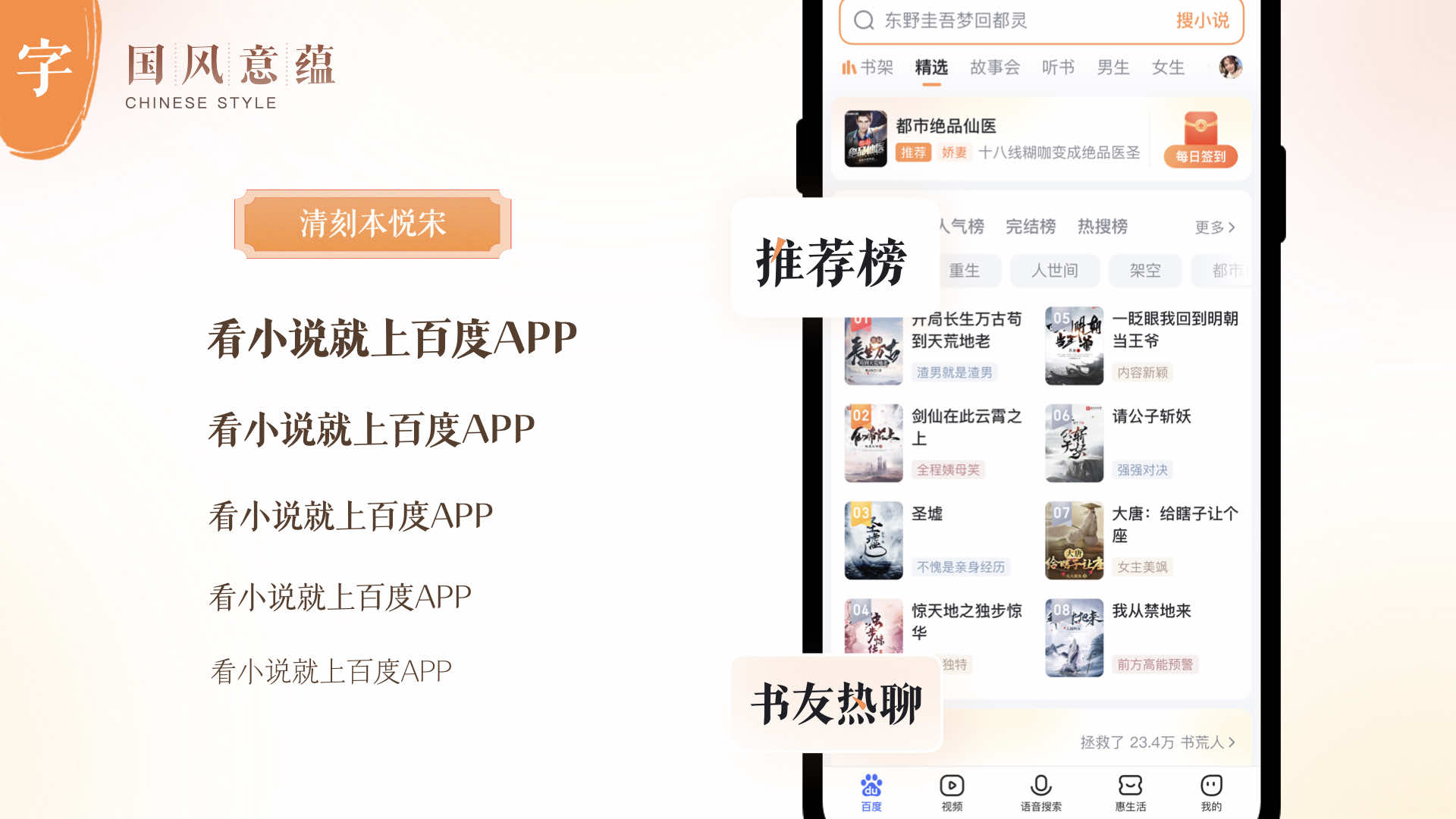 基于國(guó)風(fēng)意韻感,設(shè)計(jì)團(tuán)隊(duì)在文字的使用上,也選擇了一套襯線體字體,該字體字形瘦長(zhǎng),柔美清透且識(shí)別度高。在界面中,主要在標(biāo)題區(qū)應(yīng)用這套字體,將其中的一筆進(jìn)行跳色點(diǎn)綴,不僅讓用戶閱讀舒適,而且提升百度小說(shuō)的品牌識(shí)別度。