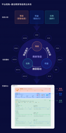 信息分層:開始頁(yè)面設(shè)計(jì)之前需要設(shè)計(jì)信息結(jié)構(gòu)和組織方式,以便商家可以輕松找到需要的信息。以商家等級(jí)為例,首先根據(jù)信息價(jià)值將信息分為<等級(jí)-權(quán)益-任務(wù)>三大類(等級(jí)作銜接、權(quán)益提供驅(qū)動(dòng)力、任務(wù)是需完成的動(dòng)作)。