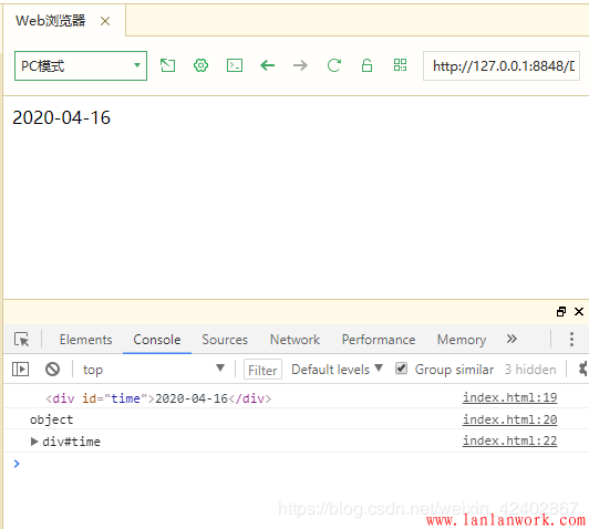<!DOCTYPE html> <html lang="zh"> <head> <meta charset="UTF-8"> <meta name="viewport" content="width=device-width, initial-scale=1.0"> <meta http-equiv="X-UA-Compatible" content="ie=edge"> <title>Document</title> </head> <body> <div id="time">2020-04-16</div> <script> // 1. 因為我們文檔頁面從上往下加載,所以先得有標簽 所以我們script寫到標簽的下面 // 2. get 獲得 element 元素 by 通過 駝峰命名法 // 3. 參數(shù) id是大小寫敏感的字符串 // 4. 返回的是一個元素對象 var timer = document.getElementById('time'); console.log(timer); console.log(typeof timer); // 5. console.dir 打印我們返回的元素對象 更好的查看里面的屬性和方法 console.dir(timer); </script> </body> </html>