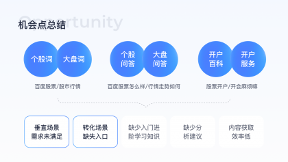 分析需求:典型搜索詞股票開(kāi)戶等轉(zhuǎn)化詞,線上僅有開(kāi)戶入口列表,但實(shí)際搜索用戶有潛在的查找開(kāi)戶方式需求未滿足,因此需先滿足用戶了解開(kāi)戶流程的需求,再提供轉(zhuǎn)化入口。