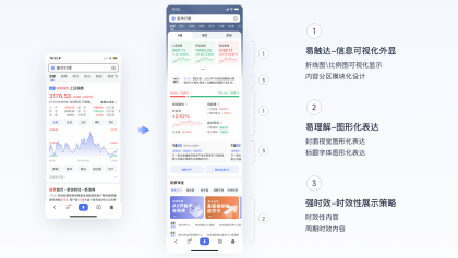 基于小白用戶經(jīng)驗(yàn)少、金融垂類(lèi)專(zhuān)業(yè)知識(shí)多晦澀難懂、數(shù)據(jù)復(fù)雜難理解的背景,制定易觸達(dá)、易理解2個(gè)策略,通過(guò)信息可視化外顯、圖表圖形化表達(dá)、關(guān)鍵信息外顯等方式降低用戶消費(fèi)門(mén)檻,提高信息獲取效率,強(qiáng)時(shí)效是基于股票特有的盤(pán)前/盤(pán)中/盤(pán)后周期性交易特征擬定的,可通過(guò)此特征打造更加差異化的滿足。