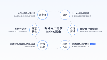 用戶需求:結(jié)合用戶高頻使用功能分析發(fā)現(xiàn)小白用戶、一般散戶、專(zhuān)業(yè)用戶均對(duì)行情功能有高頻率的使用需求,具體需求包括了解多市場(chǎng)、關(guān)鍵指數(shù)行情、了解最新快訊、重要行情動(dòng)態(tài)、盤(pán)前/盤(pán)中/盤(pán)后簡(jiǎn)報(bào),再結(jié)合小白用戶占比高且對(duì)百科內(nèi)容有需求的現(xiàn)狀,知識(shí)科普信息也是相關(guān)待滿足需求。