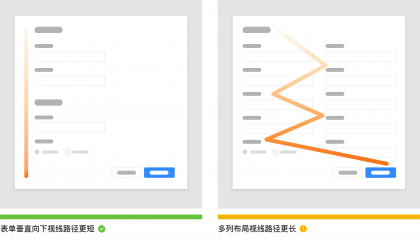 如果表單使用單列,則完成的路徑是頁面垂直向下的一條直線,單列布局能夠給用戶呈現一條清晰的視覺路。因此,表單較為簡單時盡量避免將表單分成多列,在業(yè)務場景允許的情況盡量使用單列(部分業(yè)務訴求和一些特定場景要求,多列布局會更節(jié)省垂直空間,但是多列布局需要考慮字段之間的關聯性,這里不強求一定只能使用單列布局)。