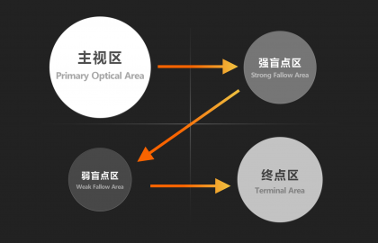 所以,界面中的左上和右下是用戶視覺最為重點關注的位置。遵循古騰堡法則,設計師應該把界面的關鍵元素放在主視區(qū),終點區(qū)可以放按鈕、強提示,盲點區(qū)可以用來放一些相對次要的內容,如輔助圖形、文字信息。
