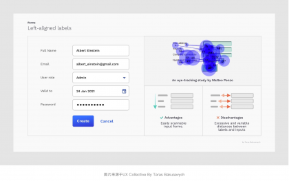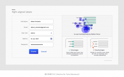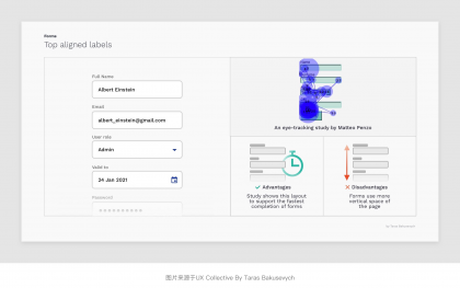 將表單標簽放置在其對應輸入字段的正上方,并垂直左對齊排列,用戶只需依次向下瀏覽即可看到標簽與輸入字段兩個元素。其優(yōu)勢是橫向屏幕空間足夠,能夠比較友好的適配多語言適合非中國區(qū)業(yè)務表單使用。并且根據上面Matteo Penzo的時間表上看,頂部對齊的瀏覽和填寫的效率也是3種常規(guī)的對齊方式中較高的一種。不足點是會占用較多的縱向垂直屏幕空間,此外應當注意每組表單標簽和輸入字段與其他字段組的間距,以免層級區(qū)分度不夠的問題。