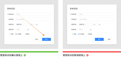 如下圖是一個彈窗類型的表單,如果根據業(yè)務訴求確認操作重要程度強于取消操作,那么確認按鈕應該放在取消按鈕的右邊。因為確認按鈕放在右側(終點區(qū)) 用戶關注度會更強。