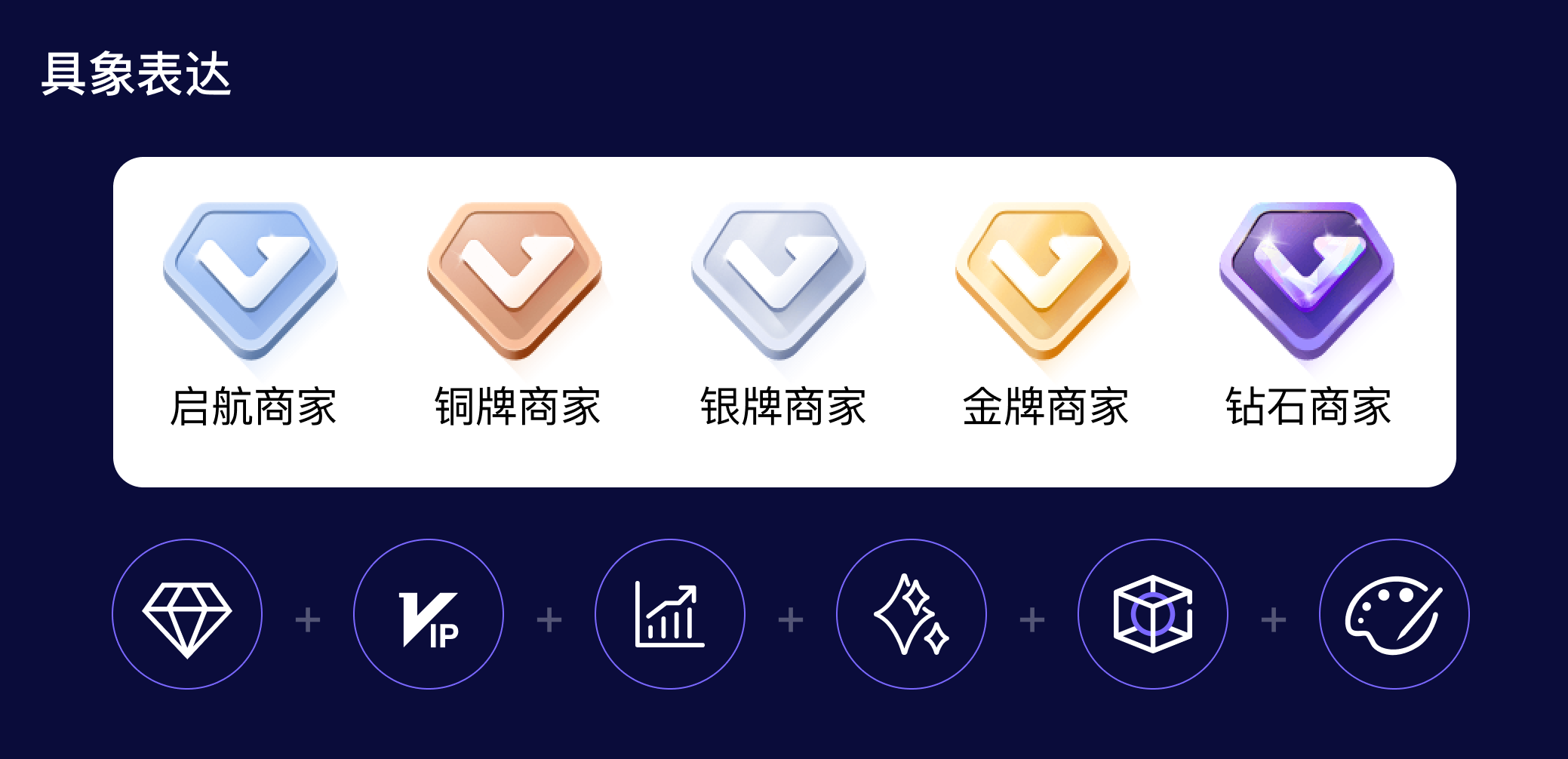 具象表達(dá):有了設(shè)計(jì)關(guān)鍵詞,通過頭腦風(fēng)暴獲取了一些可以體現(xiàn)這些關(guān)鍵詞的具體事物:鉆石、VIP、箭頭、Blingbling、3D、金銀銅等,希望通過具象的事物表達(dá)抽象的情緒詞,于是我們從「鉆石」開始入手,把鉆石和VIP、箭頭不斷結(jié)合,同時(shí)融入BlingBling,金銀銅色等具有普遍認(rèn)知的元素,用偽3D效果來增加徽標(biāo)的立體感,最終打造一種獎(jiǎng)牌的形態(tài),給客戶帶來更多榮譽(yù)感知,突出商家等級(jí)的重要性。