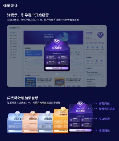 設(shè)計(jì)的基本出發(fā)點(diǎn)是幫助業(yè)務(wù)建設(shè)平臺(tái)等級(jí)模型的表達(dá)體系,將業(yè)務(wù)目標(biāo)轉(zhuǎn)化為用戶行為,設(shè)計(jì)清晰而直觀的商家分層表達(dá)體系,將不同商家等級(jí)與其對(duì)應(yīng)的特權(quán)、服務(wù)等信息進(jìn)行明確的關(guān)聯(lián)和傳達(dá),以便商家能夠快速理解和辨識(shí)商家等級(jí)的差異和優(yōu)勢(shì)。