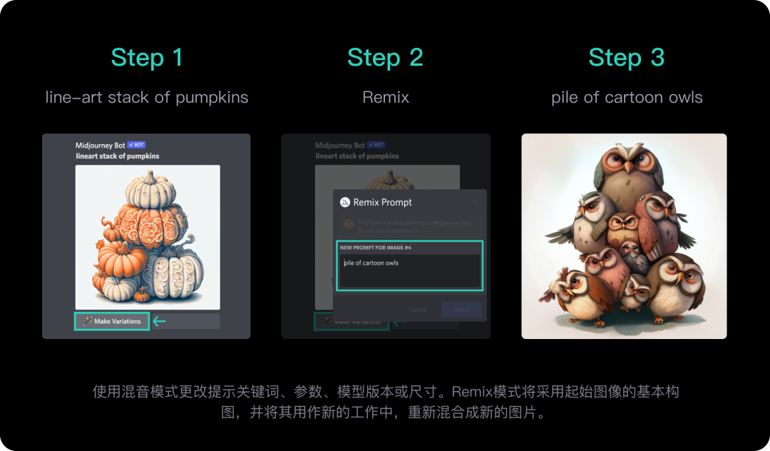 回顧之前《ASAK|全面解析Midjourney參數(shù)和指令》的案例,使用的步驟如下:點擊Make variations,在彈出窗口中修改或輸入新的提示。例如在輸入框里輸入pile of cartoon owls(一堆卡通貓頭鷹)。最終生成的圖片對應的貓頭鷹代替南瓜。