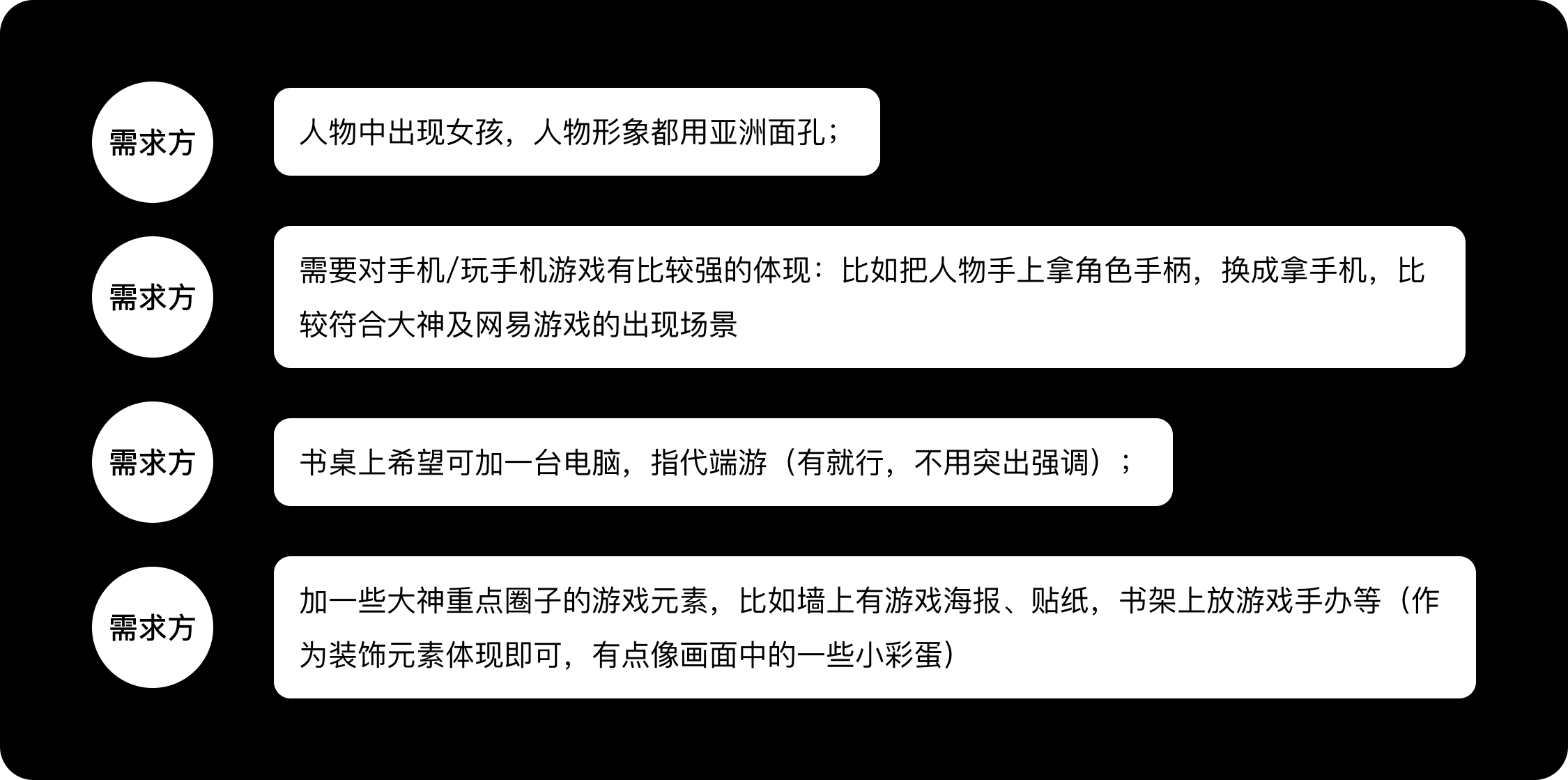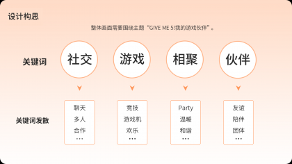需求方希望畫面能展現(xiàn)出品牌的社交感,以“游戲伙伴”為主題,畫面表達各種不同類型游戲伙伴,因我們的產(chǎn)品而相聚的場景。同時希望畫面中的人物能做出擊掌(GIVE ME 5)的動作,以此呼應品牌發(fā)布會的主題。
