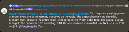 緊接著我們用之前篩選出來的其中一張或多張圖片,在Midjourney中進行墊圖,根據(jù)之前所得結論對關鍵詞進行優(yōu)化,再開始新的一輪煉圖。(關鍵詞增加了“中景”、“展示整個房間”、“透視感”、“畫面明亮”。)