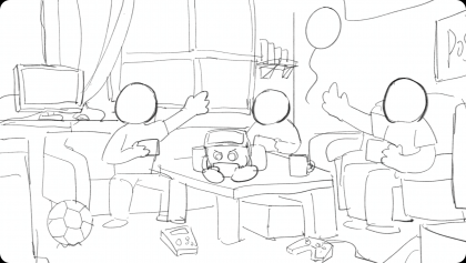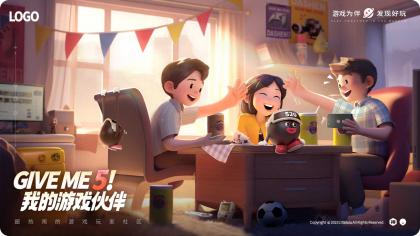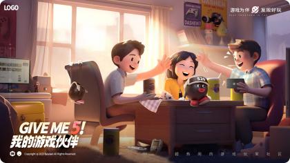 大概描繪了幾個伙伴在組隊玩游戲,因為獲得了勝利相互擊掌(give me 5)的輕松愉快的畫面。周圍有一些和游戲相關的元素,IP形象也在畫面中心露出,強調(diào)與品牌之間的關系。