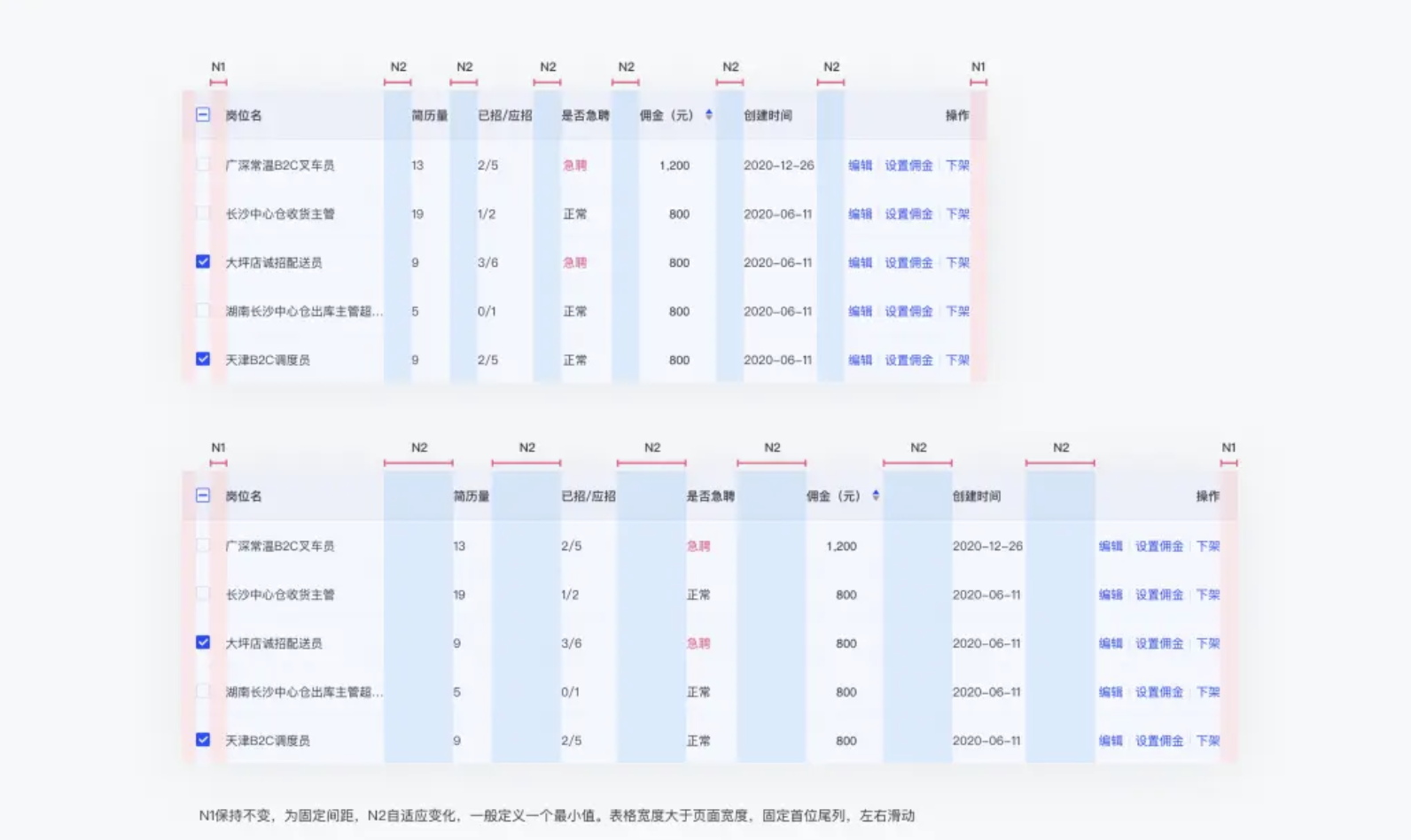 合適的填充和邊距對(duì)于視覺設(shè)計(jì)至關(guān)重要,以保證易讀性。定義列的間距時(shí),我通常的做法是N1保持不變,將N2定義一個(gè)最小值,N2再根據(jù)表格的寬度自適應(yīng)變化。表格主要適配到這個(gè)最小寬度,這一步驟通常的設(shè)計(jì)系統(tǒng)的初期就要完成,一方面可根據(jù)自己項(xiàng)目目前情況,按照導(dǎo)航寬度等固定尺寸確定最小的表格寬度,這樣在處理最小尺寸時(shí),可以有一個(gè)明確的邊界,同時(shí)能與開發(fā)同學(xué)進(jìn)行理解溝通。當(dāng)表格寬度大于頁面寬度,固定首尾列,左右滑動(dòng)。