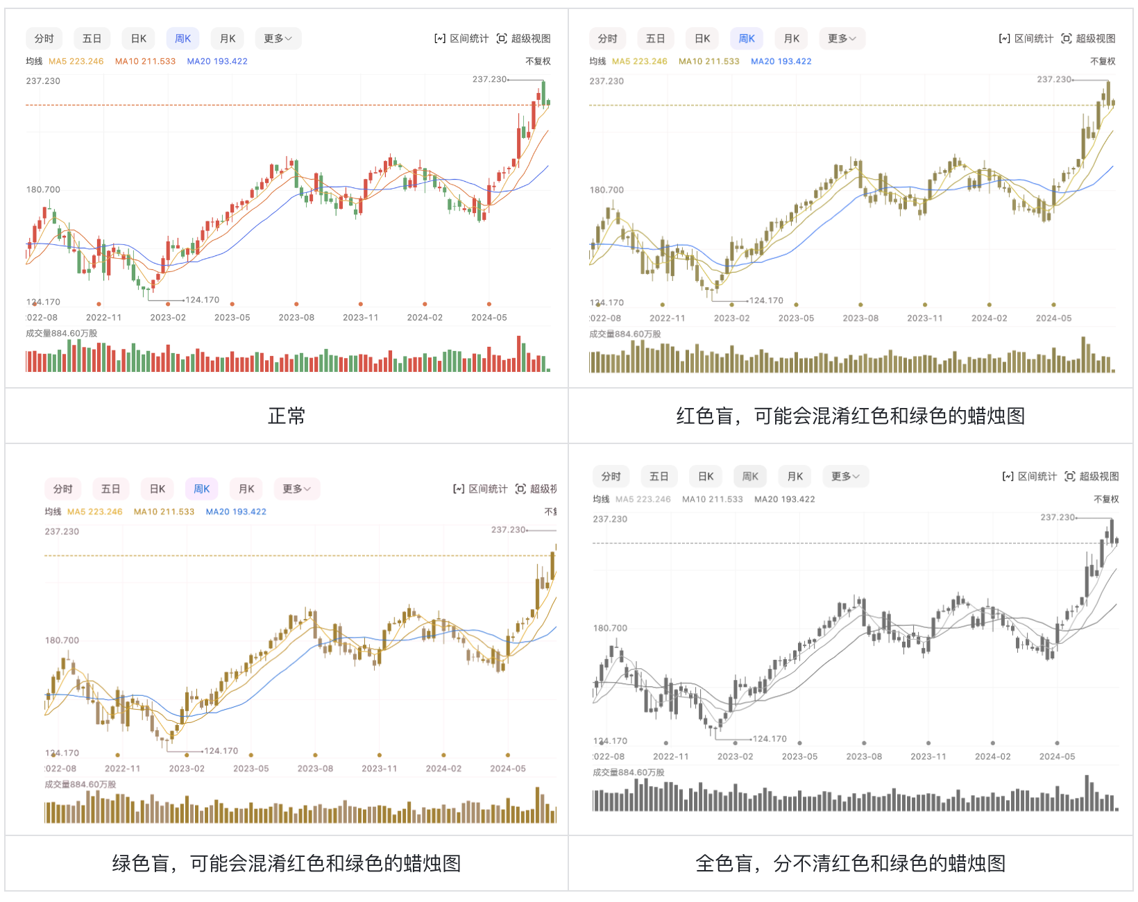 在股票市場中,顏色編碼是信息傳達的重要手段。許多分析工具使用紅色和綠色來表示虧損和盈利,這種直觀的視覺信號對大多數投資者十分有效。然而,色盲投資者在分析市場動態(tài)時,往往因無法準確分辨這些顏色而產生誤解,影響他們的決策能力。例如,紅綠色盲的投資者在分析股票個股時,可能會混淆紅色和綠色的蠟燭圖,導致錯誤的投資判斷。