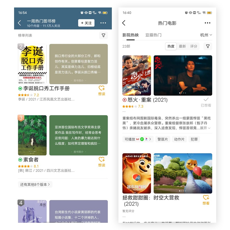 豆瓣的電影榜單設(shè)計非常巧妙:豎幅圖片完美展示電影海報,橫幅區(qū)域則用于劇照輪播。這種豎橫搭配不僅視覺和諧,還能比單圖展示更高效地利用空間。這個設(shè)計模式同樣適用于圖書榜單,橫幅區(qū)域可以展示書評。通過呈現(xiàn)豐富的信息,用戶能在列表頁就對內(nèi)容有更全面的了解,從而提高查看詳情頁的意愿。