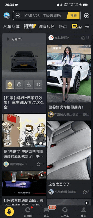 如今各大 APP 的信息流千篇一律,都是圖文、視頻、廣告的組合,用戶在不斷滑動中逐漸失去了新鮮感。懂車帝巧妙地為了推廣自家的在線 3D 看車功能,為信息流帶來了全新玩法!他們在首頁信息流中嵌入了可交互的 3D 汽車模型,這種既能觀看又能操作的創(chuàng)新形式,與傳統(tǒng)的圖文視頻形式形成鮮明對比,立即吸引了用戶的注意力,讓人忍不住想要嘗試。