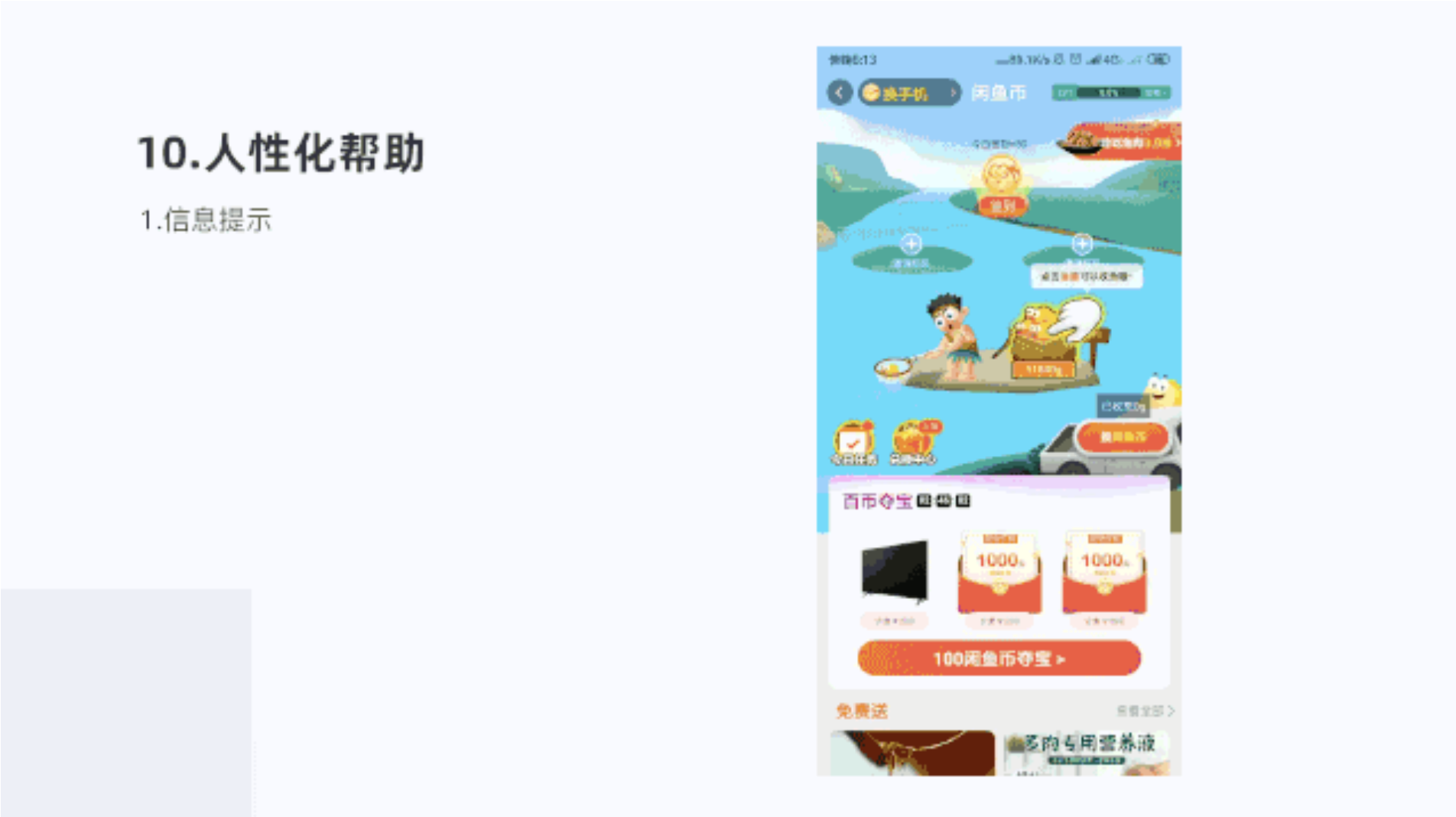 目標(biāo)引導(dǎo)設(shè)計,劃定規(guī)則和目標(biāo)路徑,引導(dǎo)用戶參與其中,在簽到活動頁面一個小路徑,用戶點擊撈魚,撈上來之后,就可以兌換閑魚幣了,讓用戶趣味游戲同時獲得閑魚幣,提升參與感,增強了用戶體驗。