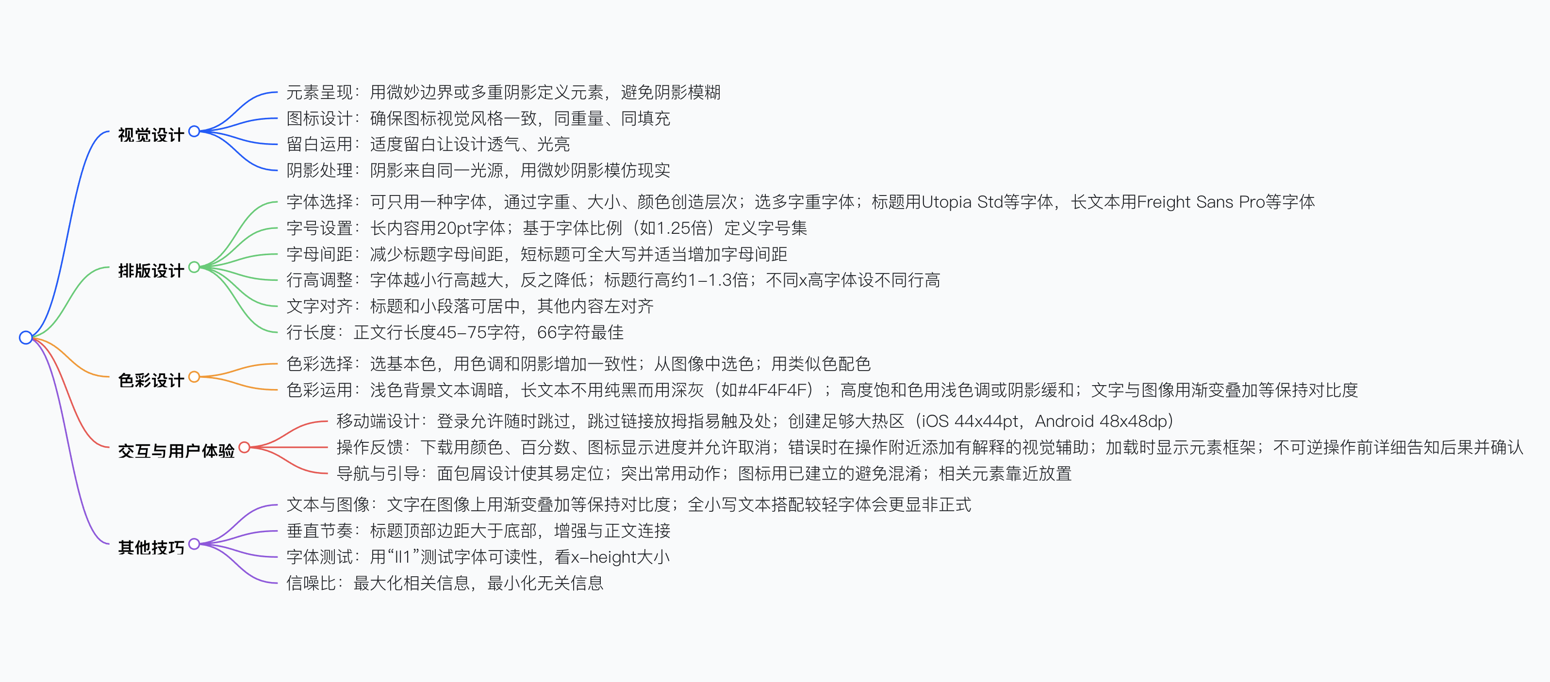 收集了 多個 UI 和 UX 設(shè)計小技巧,涵蓋視覺設(shè)計、排版、色彩、交互等多方面,包括通過微妙邊界或多重陰影讓元素更清晰、減少標(biāo)題字母間距以實現(xiàn)視覺平衡、確保圖標(biāo)風(fēng)格一致、適當(dāng)留白使設(shè)計更透氣、20pt 字體提升長文本閱讀體驗、基于字體比例定義字號集、選擇基本色并通過色調(diào)和陰影增加一致性、移動端登錄允許用戶隨時跳過并將跳過鏈接放在拇指易觸及位置、確保陰影來自同一光源、合理進(jìn)行圖層管理、通過色彩對比度等突出重要元素、錯誤時添加視覺輔助、移動端創(chuàng)建足夠大熱區(qū)、保持文字與圖像對比度等,這些技巧能通過最小調(diào)整改善設(shè)計細(xì)節(jié)和用戶體驗。