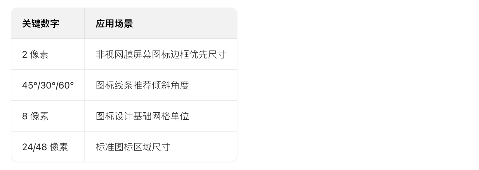 - 相鄰元素最小間隙需統(tǒng)一,線性圖標間隙應(yīng)≥線粗度,線條需明確分開或閉合,避免輪廓 “粘滯”。