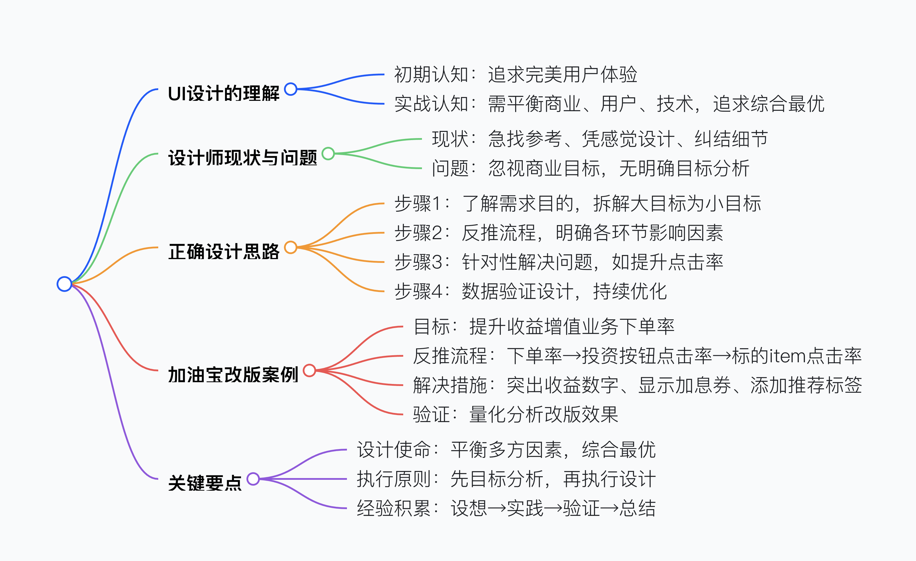 UI 設(shè)計(jì)的終極目標(biāo)并非單純追求極致用戶體驗(yàn),而是在「商業(yè)」「用戶」「技術(shù)」等多方面條件限制下取得平衡,得出「綜合最優(yōu)」的解決方案。設(shè)計(jì)師常陷入拿到需求就找參考、憑感覺設(shè)計(jì)、在細(xì)節(jié)糾結(jié)的誤區(qū),正確做法是先明確需求背后的商業(yè)目標(biāo),將大目標(biāo)拆解為小目標(biāo),如加油寶 APP6.0 改版時(shí)為提升 “收益增值業(yè)務(wù)下單率”,反推需提升標(biāo)的 item 點(diǎn)擊率、“立即投資” 按鈕點(diǎn)擊率等,再針對(duì)性解決,最后通過數(shù)據(jù)驗(yàn)證設(shè)計(jì)效果,如此才能積累經(jīng)驗(yàn)、理清思路。
