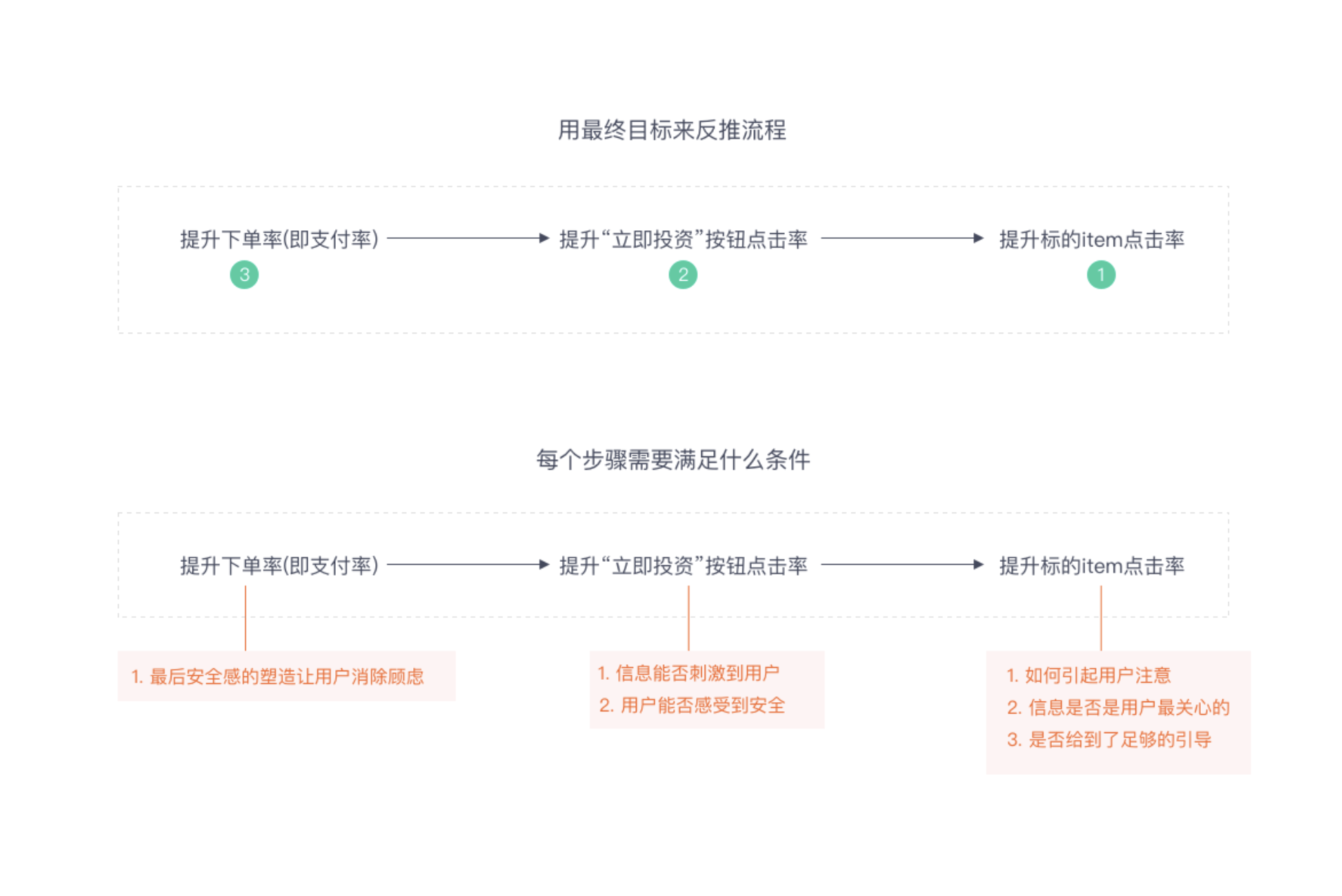 - 接到需求先了解目的,將大目標(biāo)拆分為可執(zhí)行的小目標(biāo)。例如加油寶 APP6.0 改版時(shí),核心目標(biāo)為提升「收益增值業(yè)務(wù)下單率」,拆解為:提升標(biāo)的 item 點(diǎn)擊率→提升「立即投資」按鈕點(diǎn)擊率→提升支付確認(rèn)點(diǎn)擊率。