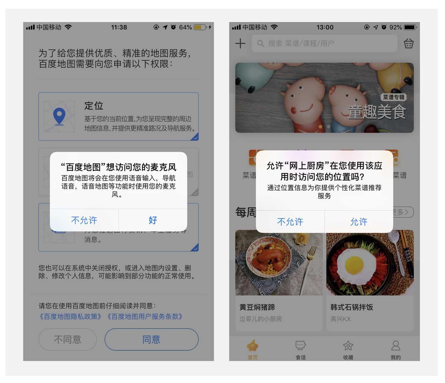 • 系統(tǒng)功能的授權(quán):如 “百度地圖” 申請(qǐng)?jiān)L問麥克風(fēng)、“網(wǎng)上廚房” 申請(qǐng)?jiān)L問位置的彈窗,這類屬于系統(tǒng)自帶的授權(quán)彈窗,在許多 APP 中都較為常見。