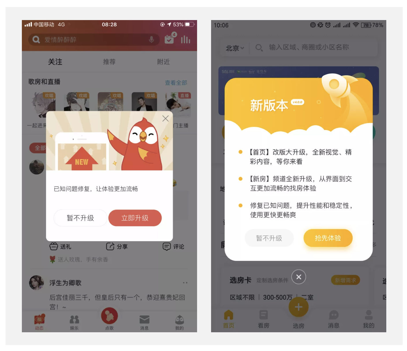 • 版本更新:版本升級(jí)彈窗通常會(huì)弱化 “暫不升級(jí)” 按鈕,突出 “升級(jí)” 主按鈕,告知用戶新版本的變化和優(yōu)勢(shì)。