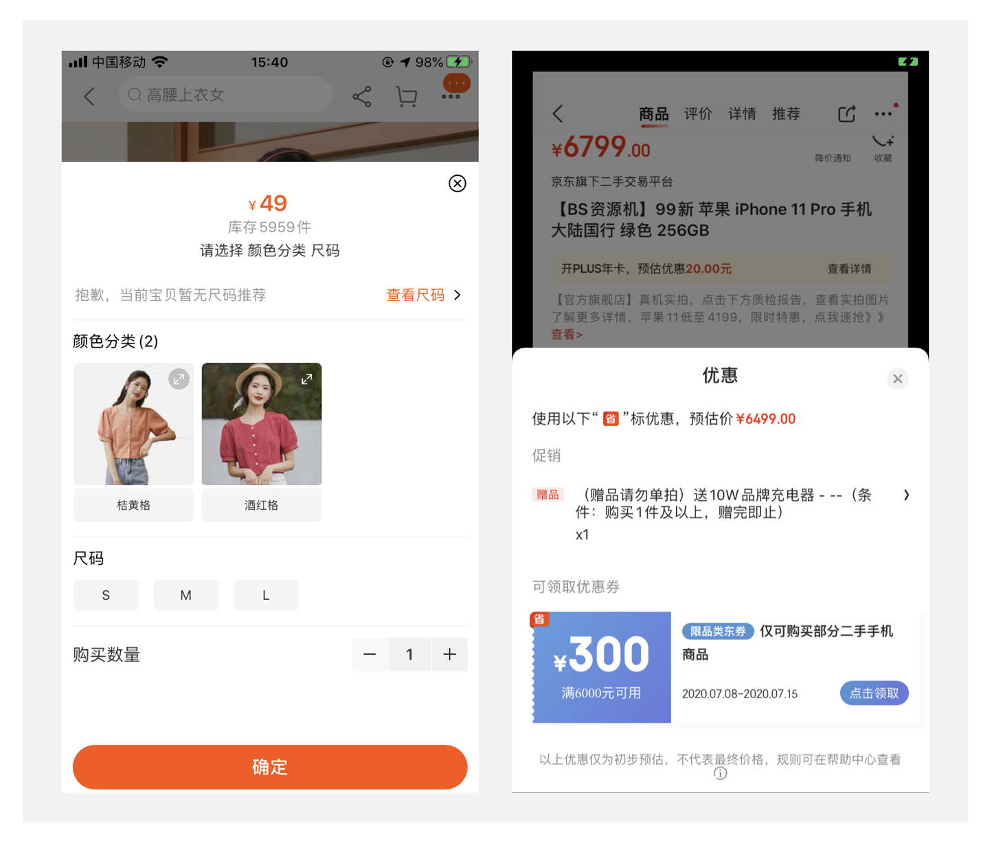 • 半屏彈窗:淘寶和京東的購(gòu)買頁面彈窗是比較典型的例子,在各種電商產(chǎn)品中應(yīng)用廣泛,方便用戶選擇商品規(guī)格、數(shù)量等。