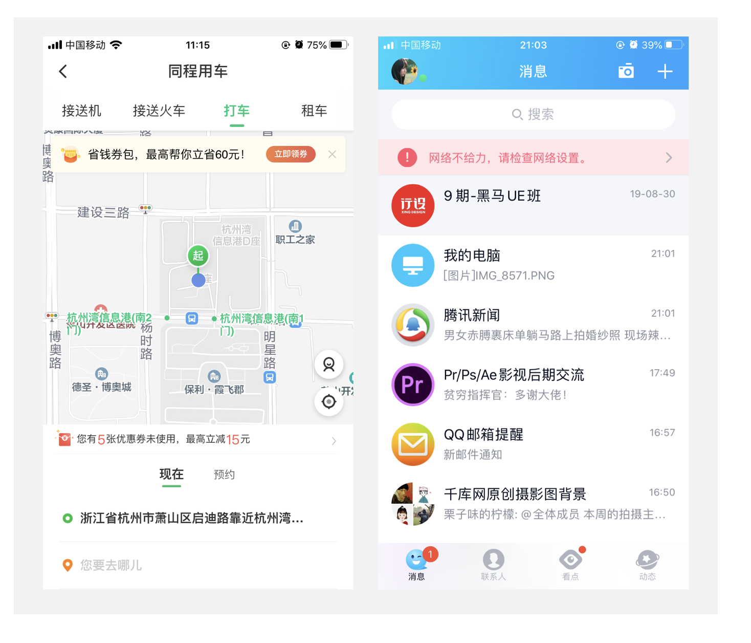 這是 Android 中的一個(gè)控件,會(huì)超時(shí)自動(dòng)關(guān)閉或者在屏幕上滑動(dòng)關(guān)閉,出現(xiàn)時(shí)間比 Toast 長(zhǎng),且可以點(diǎn)擊按鈕進(jìn)行交互。如京東的 Snackbar 提示用戶點(diǎn)擊箭頭查看喜歡的商品,為用戶推薦商品,并有關(guān)閉按鈕;酷狗音樂的 Snackbar 給用戶提供開通會(huì)員的快捷入口,一直浮于頁面底部,沒有關(guān)閉按鈕;同程用車的領(lǐng)券活動(dòng)彈窗也屬于此類,是常用的營(yíng)銷手段;QQ 的斷網(wǎng)提示類似通知條樣式,會(huì)浮于頁面上方直到網(wǎng)絡(luò)恢復(fù)。