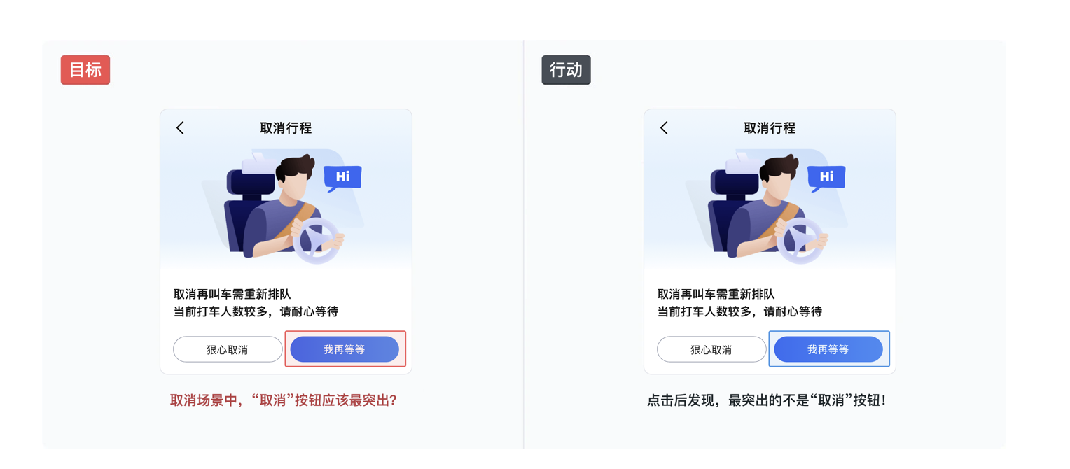 比如看到 APP 里一個(gè)顯眼的紅色按鈕,以為是 “返回”,點(diǎn)擊后卻發(fā)現(xiàn)是 “提交訂單”;在打車(chē)軟件里,把 “狠心取消” 當(dāng)成 “查看詳情”。這種錯(cuò)誤源于 “規(guī)劃階段”,是界面信息混亂、層級(jí)不清晰導(dǎo)致的 —— 用戶不是手滑,是被設(shè)計(jì) “誤導(dǎo)” 了。