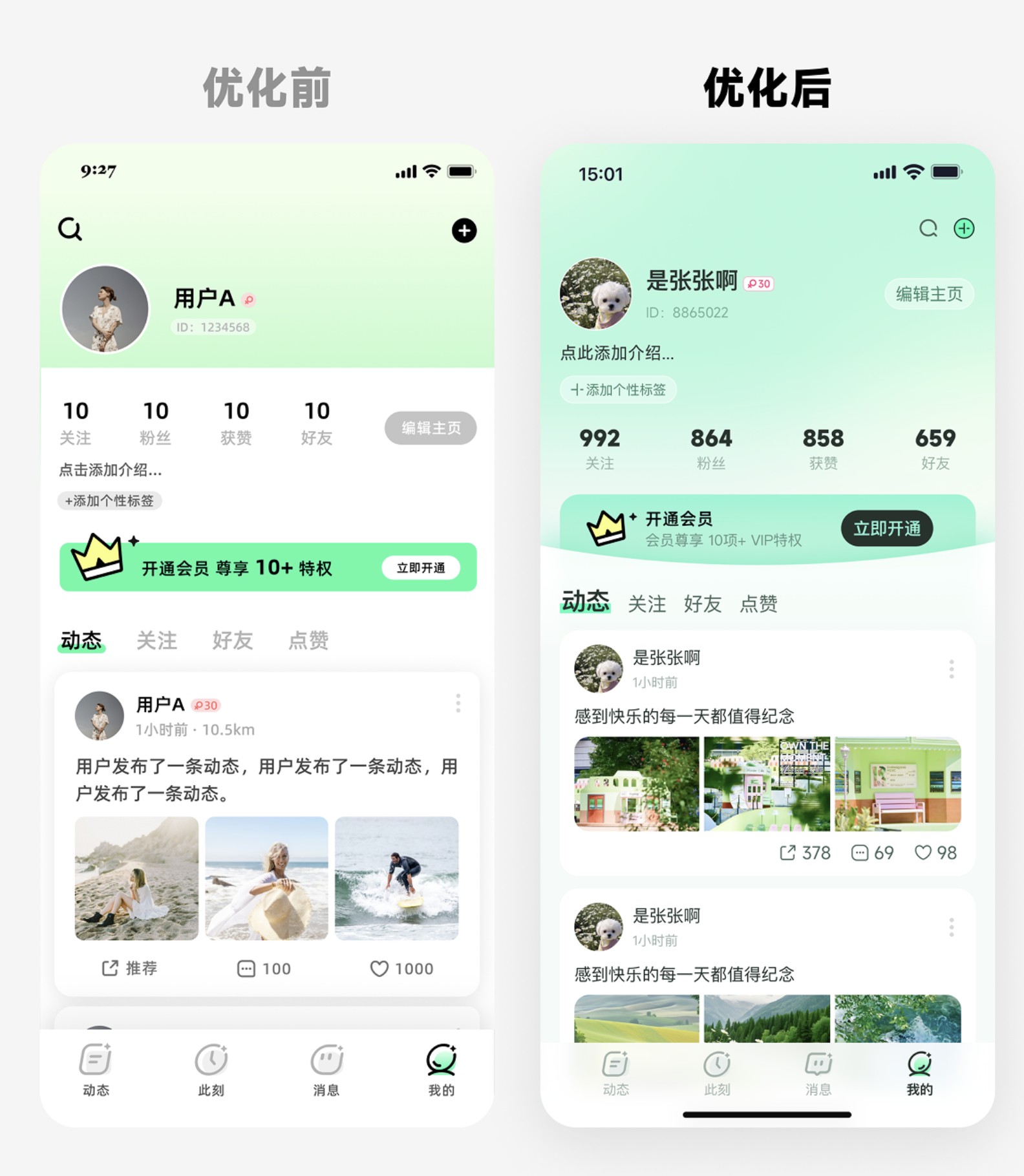 2. 輕分割:用淺灰色背景分割不同的動(dòng)態(tài)卡片,替代之前厚重的投影 —— 既區(qū)分了模塊,又不會(huì)讓頁面顯得 “笨重”;