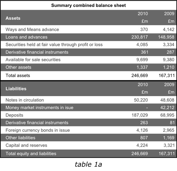 下面的英格蘭銀行2010年年報(bào)的一組信息被分成了兩個(gè)表格,但仍然體現(xiàn)為一個(gè)整體。紫色的表頭清晰的給出了標(biāo)題,標(biāo)題行僅用了一次表頭(2009、2010)和單位(英鎊)。兩個(gè)表格采用同種顏色加粗的字體作為標(biāo)題,清晰而相互獨(dú)立。兩表各自的最后一行也采用了同樣顏色的下劃線。