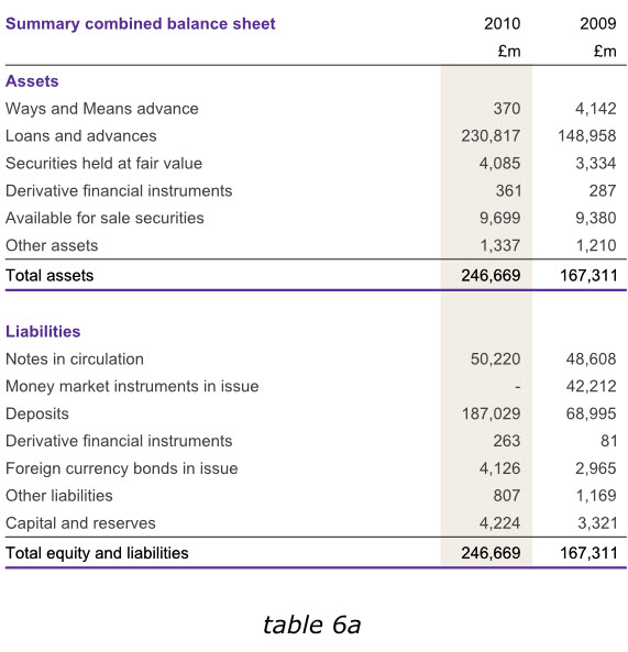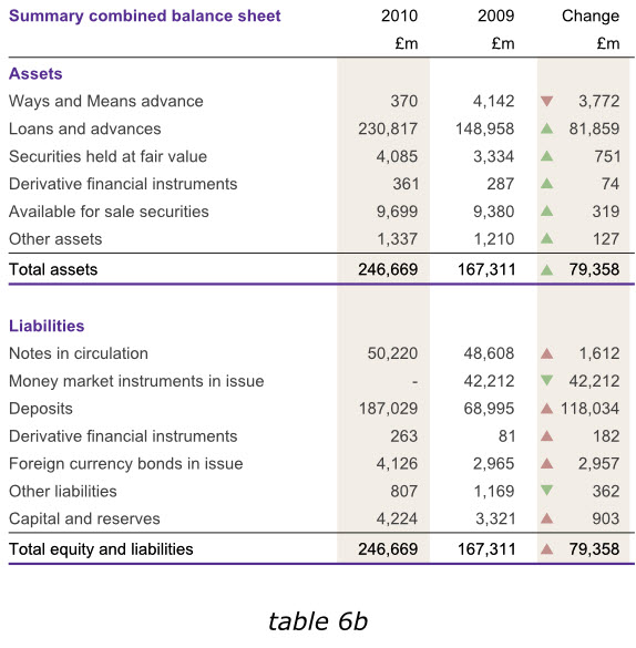在英格蘭銀行2010年度報(bào)告中,盡管我們不能通過改變數(shù)據(jù)來達(dá)到讀者的期望,但是在其他同樣的報(bào)告中,我們在末尾增加一列有用的數(shù)據(jù),以避免用戶在比較各年度數(shù)據(jù)的時(shí)候,還需要自行計(jì)算增長或減少的幅度。下面第一個(gè)表格6a已經(jīng)增加了總資產(chǎn)和總負(fù)債數(shù)據(jù),而表格6b則在右側(cè)增加了新的一列,使我們更容易分析出哪些領(lǐng)域的經(jīng)營成果發(fā)生了實(shí)質(zhì)性變動。