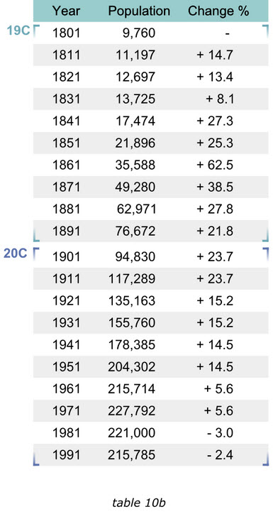當(dāng)我們在撰寫wikipedia上的Trafford條目時(shí),有一個(gè)1801至1991年的人口變化表格10a,他包含有2行20列,讀者必須記住有關(guān)信息,并且不停的對照表頭和數(shù)值來確認(rèn)他們的關(guān)系,否則他們就無法獲得趨勢信息。