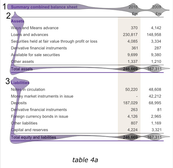 在表格中尋找信息時(shí),讀者希望前后采用同樣風(fēng)格,你應(yīng)該保證對同類元素使用同樣的字體,對同類數(shù)據(jù)使用同種對齊方式,還有諸如“列標(biāo)題”等各種突出顯示元素的一致性。看一下下面的表格7a,他展示了和前面表格1b同樣的英格蘭銀行2010年度數(shù)據(jù)信息。但是使用了有區(qū)分的表頭字體,標(biāo)簽以及加總格式,表頭采用了居中格式而不是和數(shù)據(jù)一樣右對齊,加總數(shù)據(jù)也沒有與數(shù)據(jù)嚴(yán)格對齊,同時(shí)為了區(qū)別資產(chǎn)和負(fù)債表格,他分別采用了不同顏色的字體,和表格中間粗細(xì)不同的線條。而所有這些實(shí)際上都讓我們產(chǎn)生一種不連貫的感覺,從而給瀏覽表格,把握重點(diǎn)帶來難度。