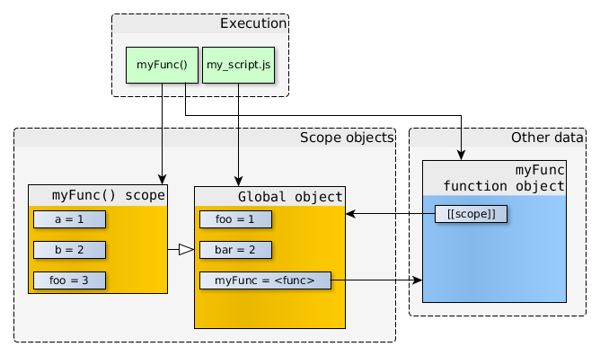 在上面的代碼中,我們有一個(gè)執(zhí)行的上下文(myscript.js自身的代碼),以及它所引用的作用域?qū)ο?。全局?duì)象里面還含有很多不同的屬性,在這里我們就忽略掉了。
