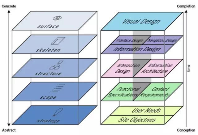 想了解 UI/UX,就一定要了解這張圖,這是 Jesse James Garrett 在2000年發(fā)表的用戶(hù)經(jīng)驗(yàn)元素一書(shū)中所提出:使用者的經(jīng)驗(yàn)可分成抽象到具體,也就是由策略、范圍、結(jié)構(gòu)、骨架、表層所構(gòu)成。