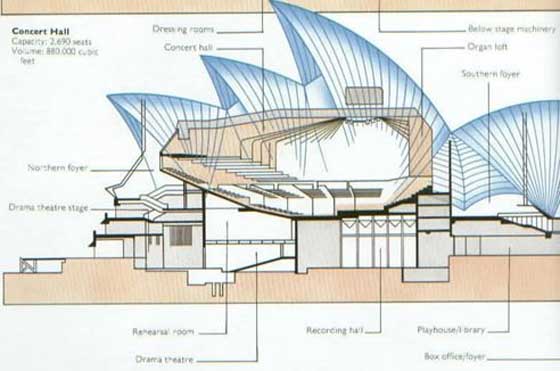屋頂設(shè)計,但關(guān)鍵在于木頭模型好做,巨大的水泥真家伙建造難度實在是太大了,設(shè)計在后來的建造過程中被反復修改。 第一個大麻煩是烏特松拒絕了多支柱承重頂板和輕鋼結(jié)構(gòu)的建議,而堅持使用水泥澆筑的工藝,結(jié)構(gòu)設(shè)計就此停滯,甚至結(jié)構(gòu)工程師艾拉普(Ove Arup)決定不接這玩命的活了。此時烏特松的才華又一次得到展現(xiàn),當他一籌莫展地坐在廚房里看著妻子切橘子的時候,他突然發(fā)現(xiàn)彎曲的橘子皮一個一個都站在案板上。他抱著橘子皮跑到艾拉普(Ove Arup)面前興奮不已,所有的結(jié)構(gòu)工程師頓開茅塞,此后水泥預制件開始在建筑業(yè)興起。1958年3月,烏松和艾拉普(Ove Arup)第二次次拜訪了悉尼的時候,他們聯(lián)合發(fā)表了名為紅皮書的悉尼歌劇院初步設(shè)計方案。 高興了沒幾天第二個大麻煩接踵而來,既然是構(gòu)建預制建筑,那么各構(gòu)件的標準化精度就是一個難以攻克的問題,要知道當時的計算機還沒在建筑領(lǐng)域廣泛使用,尤 其是建筑如此巨大的球形屋頂,多次拼合,機構(gòu)工程師無法準確計算出每一塊屋頂?shù)幕《扰c分割,這樣就不能天衣無縫地組合在一起。從1957年到1963年