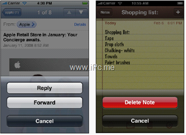 屏幕的底部一般是輔助性的工具欄或切換視圖使用的頁簽欄。一些影響較大的操作如果出現(xiàn)在屏幕下半?yún)^(qū)域,必須仔細考慮它們的排列設計。如圖5.1,一 般情況下,操作面板的取消按鈕放在最后,這樣可以鼓勵用戶閱讀完所有的選項,暗藍色的返回按鈕可以和一般的按鈕區(qū)分開來,即便用戶沒閱讀完也知道這是返回 按鈕。對于一些影響較大的操作(如刪除),將其放在面板的頂部是最好的,因為頂部更容易被看到,再加上紅色的警告暗示,用戶選擇起來會更為慎重。