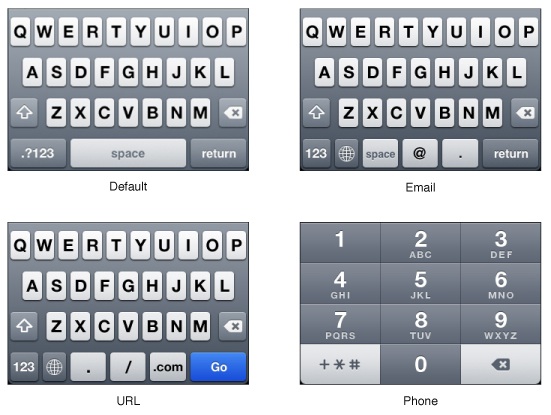 - 智能手機(jī)的系統(tǒng)平臺(tái)當(dāng)中通常都會(huì)內(nèi)置一些針對(duì)不同類型內(nèi)容的鍵盤(pán),例如文本、數(shù)字、Email、URL等。在你的應(yīng)用中,確保針對(duì)不同的內(nèi)容類型使用對(duì)應(yīng)的鍵盤(pán),提升用戶輸入的效率。