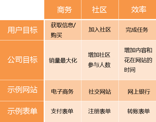 讓我們通過討論表單的三個(gè)主要作用來闡述下最后這一點(diǎn)。就像Luke Wroblewski在他的《web表單設(shè)計(jì):點(diǎn)石成金的藝術(shù) 》一書中說的一樣,每個(gè)表單的存在必有如下三個(gè)原因之一:商務(wù)、社區(qū)或效率。下面的表單把這三個(gè)原因轉(zhuǎn)化成了其背后的用戶目標(biāo)和公司目標(biāo):