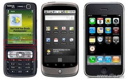 在底部的幾個按鍵的處理上(返回、菜單、home  、搜索),Android  的做法似乎介于傳統(tǒng)手機和iPhone  兩者之間,既保留了傳統(tǒng)手機的一些特性,但也在學習iPhone  的觸屏做法。  從蘋果遵循極簡的設計思路來看,  iPhone   做得更徹底、更加一 些。