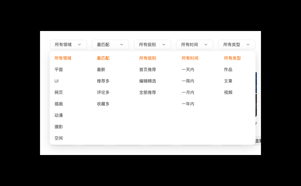 我們可以通過,將這些選擇進(jìn)行分類打包,以站酷為例子將類似功能進(jìn)行分類或者分頁面,幫助用戶梳理進(jìn)行梳理。