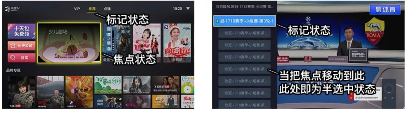 可能需要簡單講述一下“標(biāo)記狀態(tài)”和“半選中狀態(tài)”:“標(biāo)記狀態(tài)”在PC和手機(jī)端也非常常見,比如告知用戶所在位置在哪里的Tab標(biāo)記;而“半選中狀態(tài)”是“焦點(diǎn)狀態(tài)”的一種情況,即移動到某個(gè)焦點(diǎn)后,不進(jìn)行加載或觸發(fā)操作,需按“OK鍵”才觸發(fā),如圖15所示。這種狀態(tài)在早期電視盒子性能不足、在Tab切換時(shí)經(jīng)常需要使用,因?yàn)槿绻苯忧袚Q焦點(diǎn)時(shí)就加載,可能會造成卡頓。