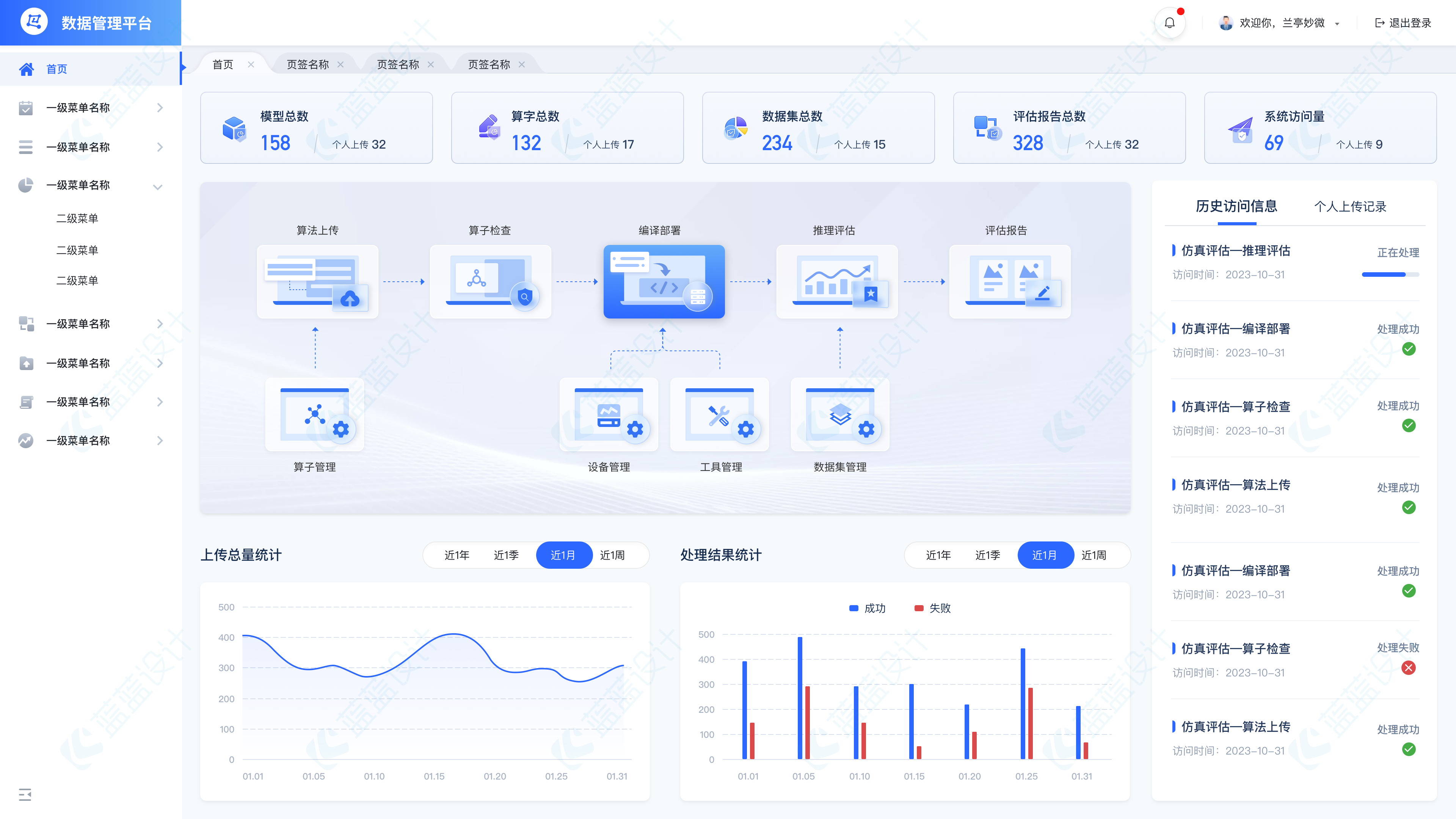 (二)該系統(tǒng)的原首頁中信息量比較少,在設(shè)計時除了對頁面美觀的優(yōu)化,從內(nèi)容、布局、用戶使用場景、使用習(xí)慣、交互方式等方 面也進行考慮,增加了一些統(tǒng)計的圖表, 「歷史訪問信息」采用卡片式列表,突出模塊和內(nèi)容。同時增加「個人上傳記錄」信息和「歷史訪問信息」可以進行 切換查看。